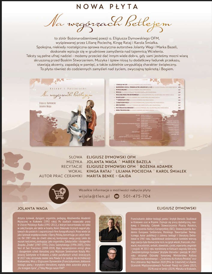 Spokojna, niekiedy nostalgiczna oprawa muzyczna autorstwa Jolanty Wagi i Marka Bazeli, płyta CD "Na wzgórzach Betlejem", to przepiękny zbiór Bożonarodzeniowej poezji o. Eligiusza Dymowskiego, wyśpiewanej przez Lilianę Pociechę, Kingę Rataj i Karola Śmiałka.